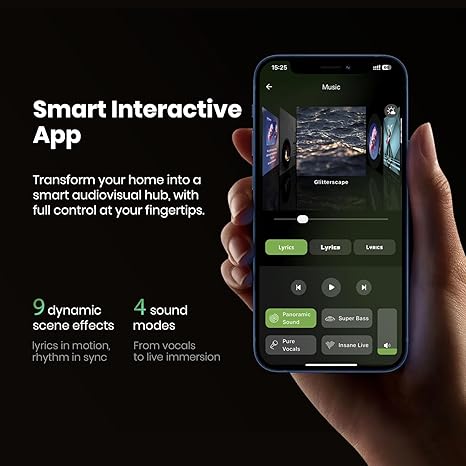 - 🎛️ Total Control in Your Hands: Use the dedicated app to stream music via Wi-Fi or Bluetooth from Spotify, Apple Music, and more. Personalize your experience with 9 scene effects, 4 sound modes, and toggle between a virtual clock or screen-off mode.